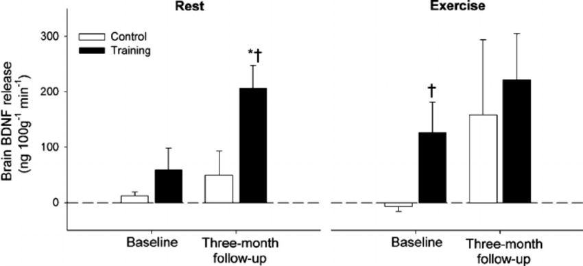 Figure 2. Brain-derived neurotrophic factor (BDNF) release at rest and during exercise in trained and control groups. Adapted from Rasmussen et al. (2009).