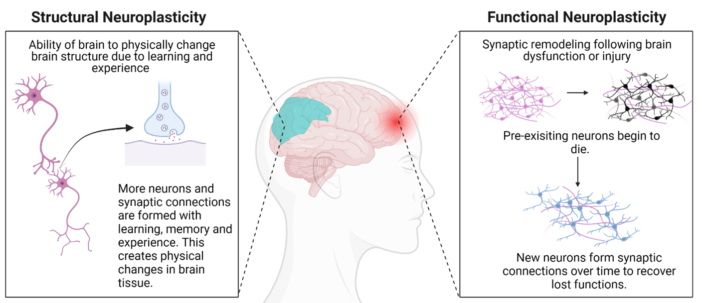 Figure 1. Neuroplasticity is popularly categorized into two categories: structural and functional. Structural neuroplasticity refers to physical brain tissue remodeling in response to learning and new experiences whereas functional neuroplasticity occurs when existing neurons propagate and form new synaptic connections after functional loss following injury. Image created with Biorender.com.